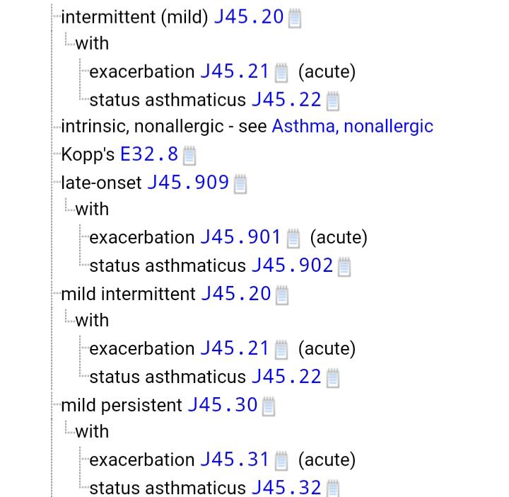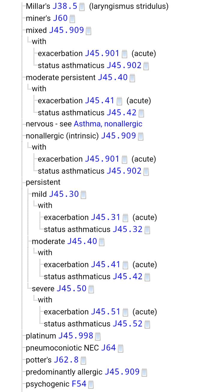 ICD codes are arranged in alphabetical order. One should clearly understand the type of asthma and code to the highest specificity. Most types of Asthma fall into category J45.