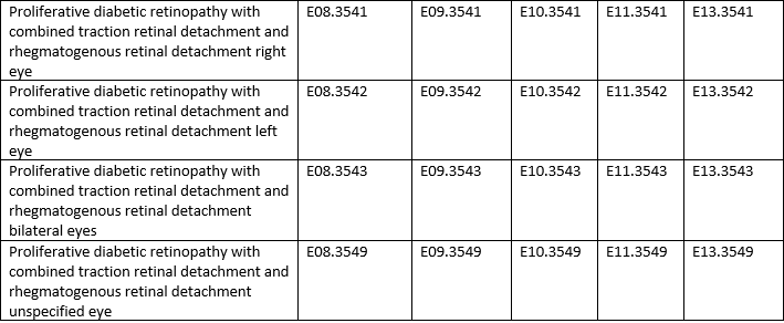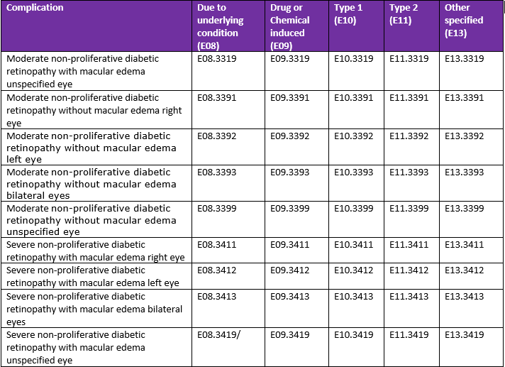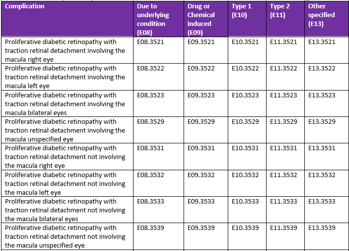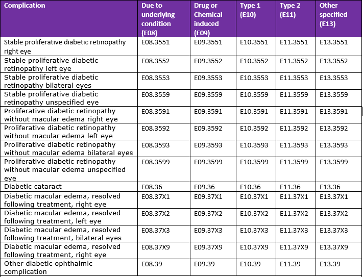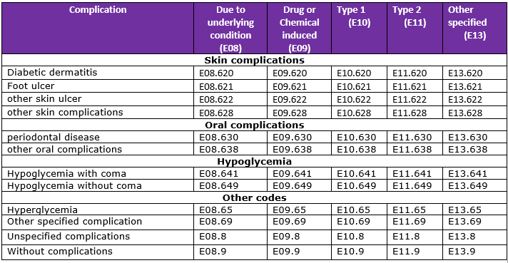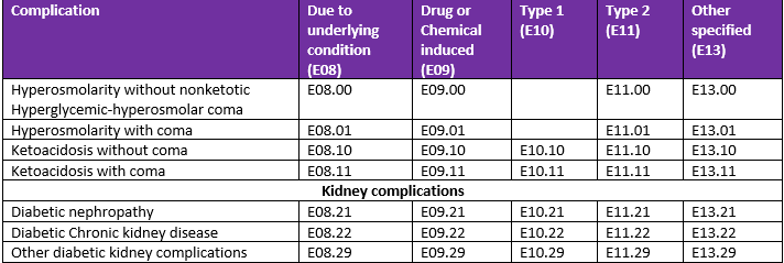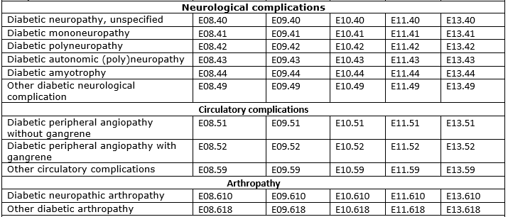 Complications of Diabetes mellitus ICD 10 codes: