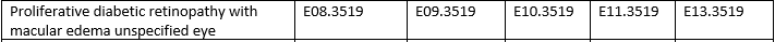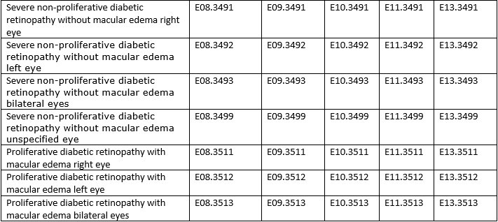 A 45-year-old female patient, Annie comes to visit her physician with drug induced diabetes mellitus with severe proliferative diabetic retinopathy with macular edema of the right eye. Assign the appropriate ICD-10-CM diagnosis code for her condition. Ans: E09.3511 |