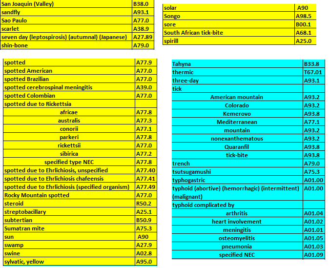 - The ICD-10-CM code A77.1 is applicable to _________, _____________, _____________, ___________, __________, ________, __________.