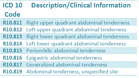 Simply documenting “Abdominal pain” does not suffice the requirements for accurate coding. The location and the type also need to be specifically documented and to make things easier, it is also important that the terminologies used to document the location and type matches the descriptions in the ICD-10-CM manual.