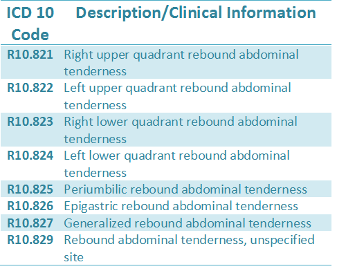 The ICD 10 code for abdominal pain is arranged in the ICD-10 manual based on the severity of the pain. The list starts with the code R10.0 which represents the most severe or painful condition acute abdomen. The 4th digits 1,2 and 3 represents upper abdomen, pelvis and perineum and lower abdomen respectively and the digit 8 covers the other conditions- colic, generalized pain, tenderness, and rebound tenderness.