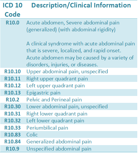 The ICD 10 code for abdominal pain is a set of signs and symptom codes which can be coded only in the absence of a specific or definitive diagnosis.