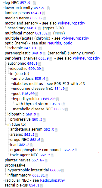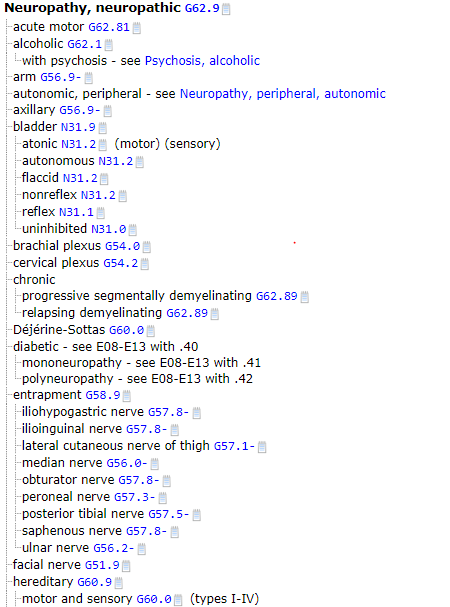 Most of the neuropathy ICD 10 codes are located in Chapter-6 of ICD-10-CM manual which is “diseases of the nervous system”, code range G00-G99